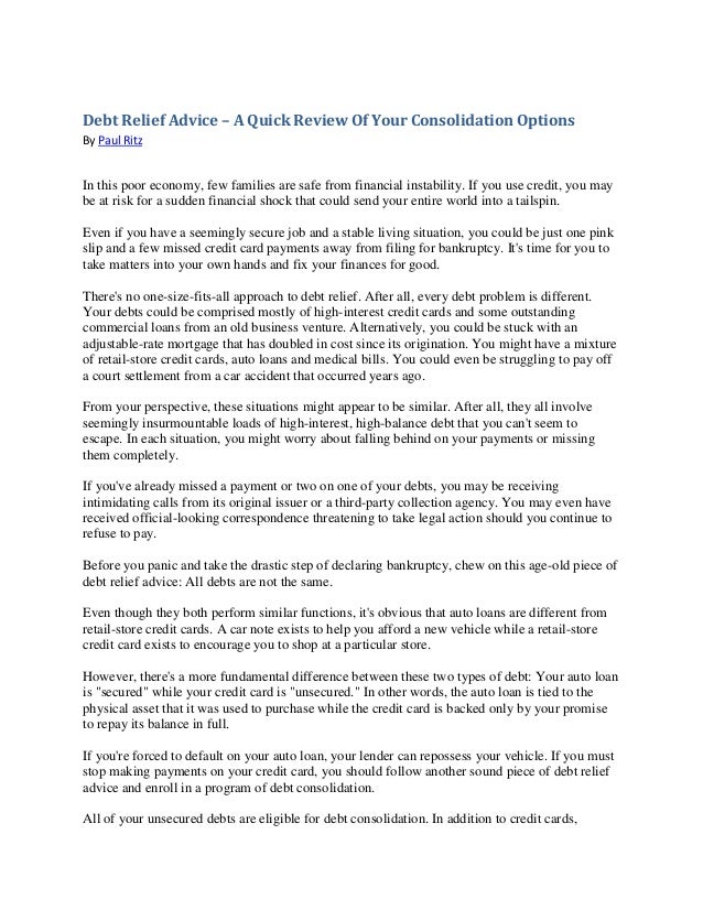 Relief. Resist this one. You will only be transferring your problems from one NIL, THE CASH IS QUICK YOU CAN GET OUT OF DEBT, IF YOU ARE PATIENT AND SELF-DISCIPLINED. ONCE YOUR ... View This Document